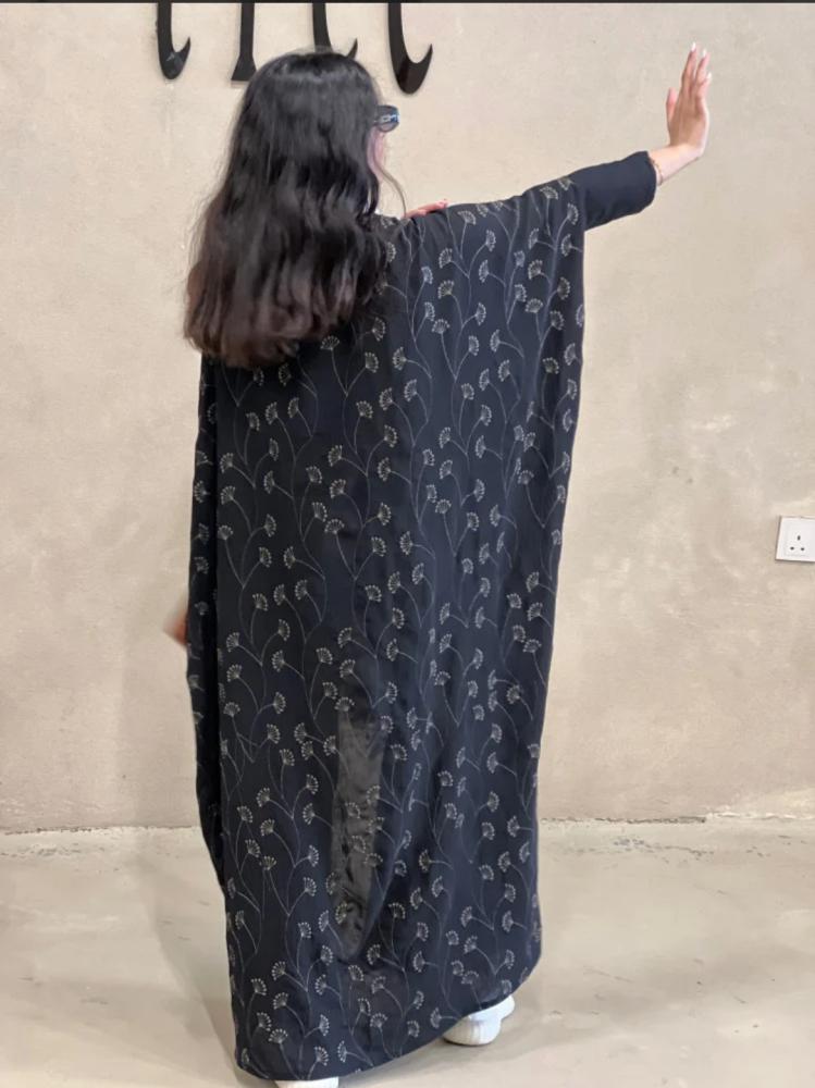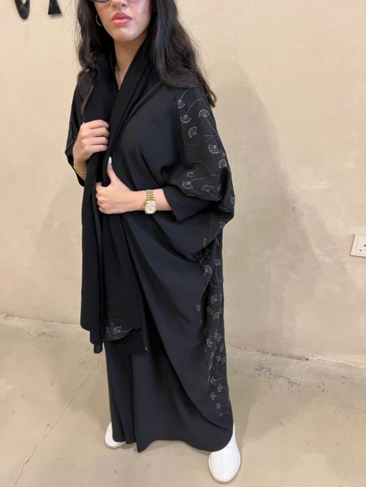 عباية نص بشت مطرزة من الخلف + طرحة لونها اسودالتطريز وردات لونها ذهبيالقماش: كريباللون اسودالعباية لف + فيها طقطق